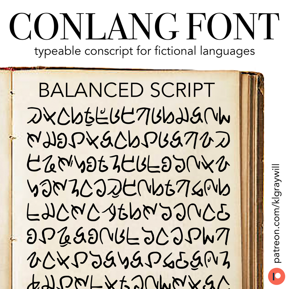 This is a conlang script you can type with, using your computer or tablet. The script comes in standard OTF/TTF font files which work with a standard English keyboard, but you can apply it to your conlang as you see fit. You can also watch my YouTube walkthrough on how to build your own conlang fonts or join my Patreon where I release a new conlang font to my patrons every month.
