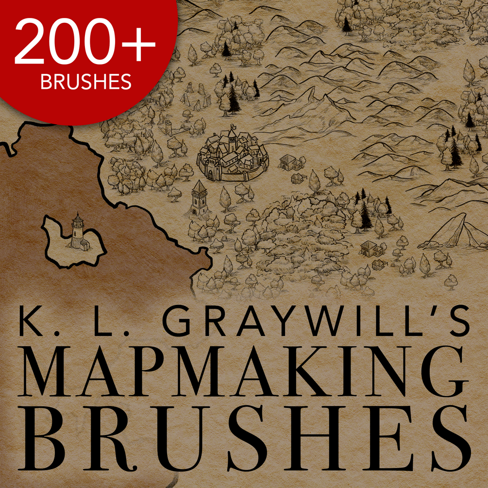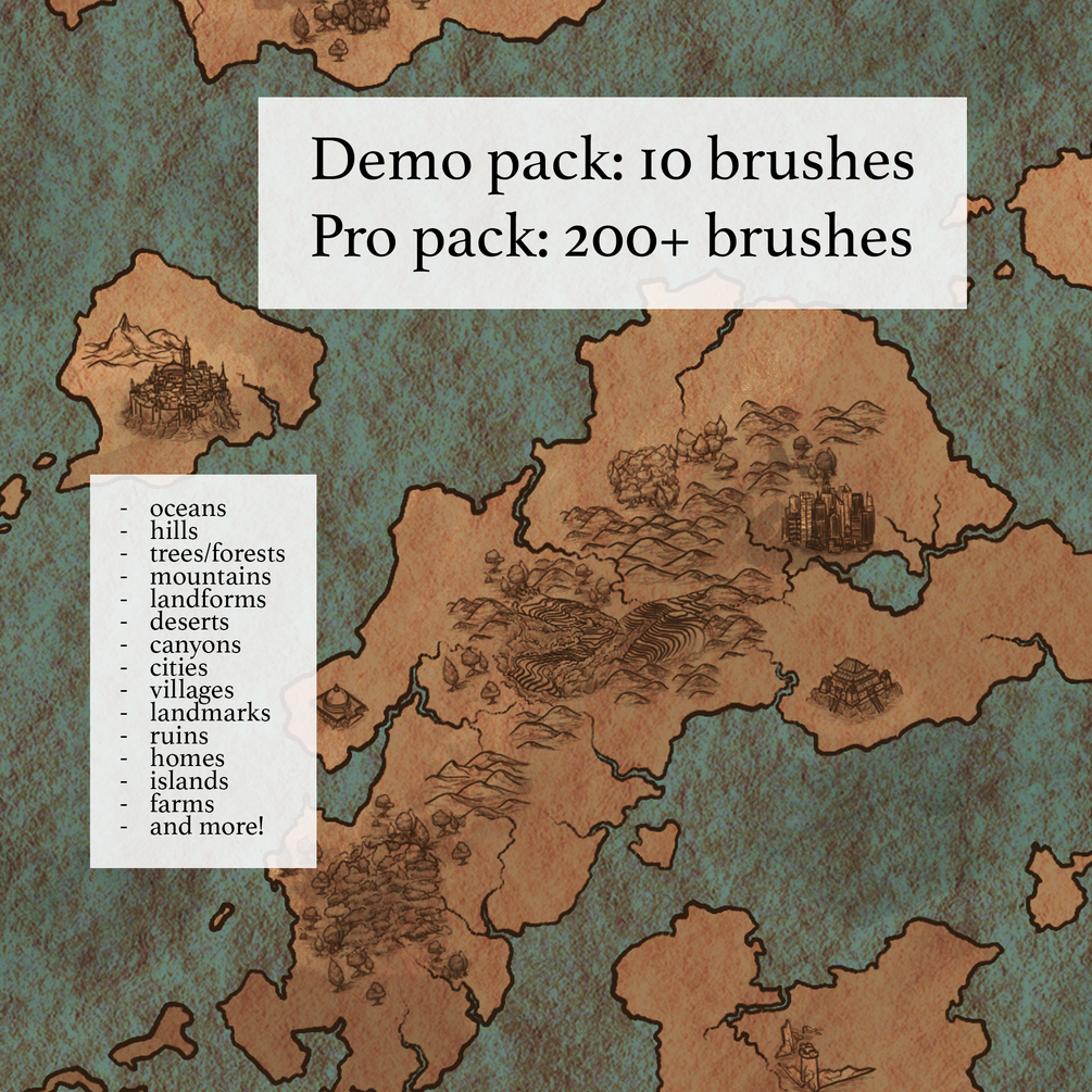 This pack of digital art brushes contains brush stamps I created for mapmaking or cartography. The Demo Pack has one brush from the following categories: trees, mountains, hills, natural formations, canyons/ravines, deserts, cities, villages, landmarks, and ruins. The Pro Pack contains brushes in these categories plus homes, islands, farms, oceans, and more - each category has ~10-15 brushes to minimize repeating elements and give you tons of customization options.